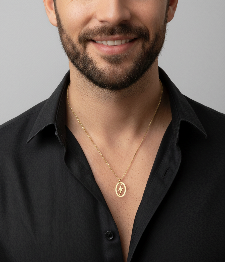 This necklace is not just a mere flash of fashion, no. It's a bolt of brilliance around your neck. A necklace in 925 sterling silver, plated with two microns of 21-karat gold, designed for lovers of speed, for those who are faster than a snap. This jewel is a tribute to your inner spark. It's for those who wake up energized and live life at a thousand volts, for those who don't need coffee because they already have electricity in their blood. With this jewel, you'll be the most stylish storm in the city, and it's always wise to warn others of the danger.